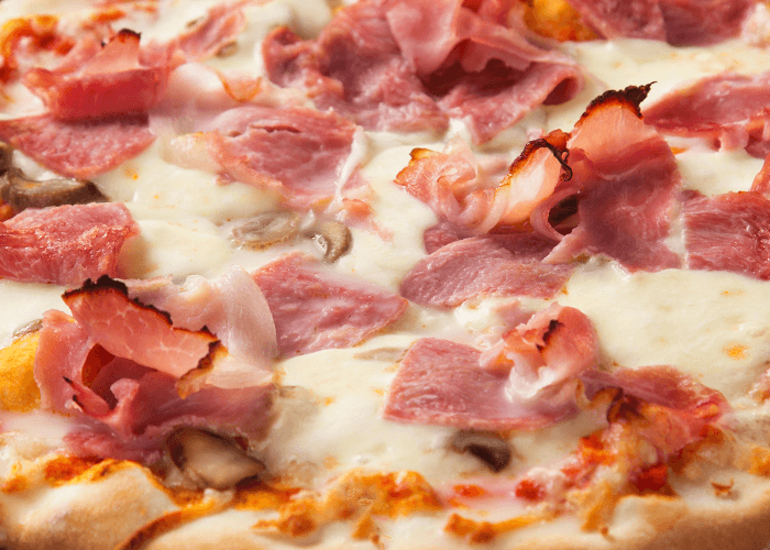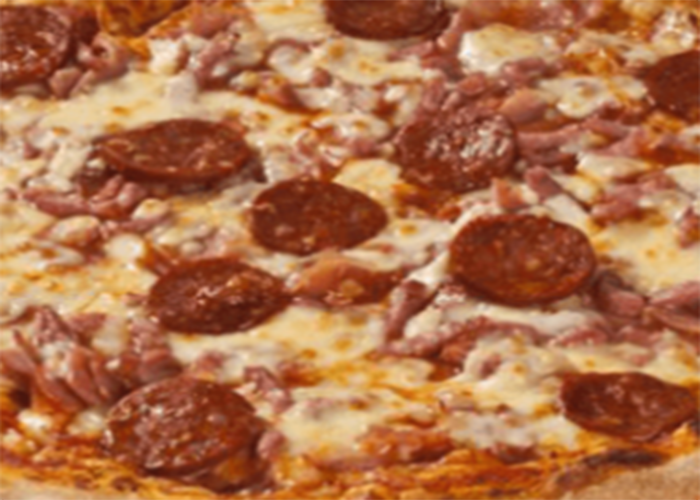Tomate, fromage, lardons, jambon, pepperoni.
