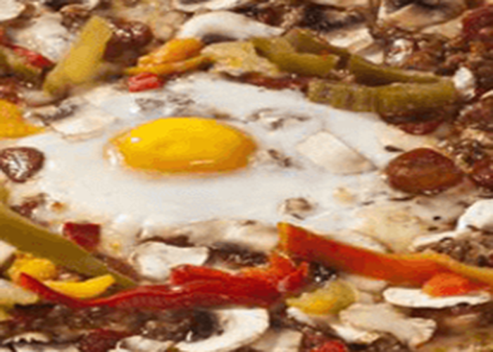 Tomate, fromage, merguez, boeuf haché, oeuf.