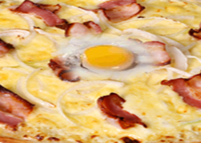 Tomate, fromage, bacon, oignons, oeuf, crème fraîche.