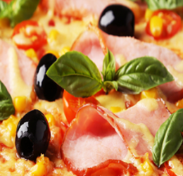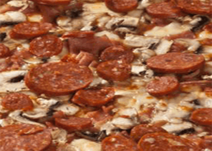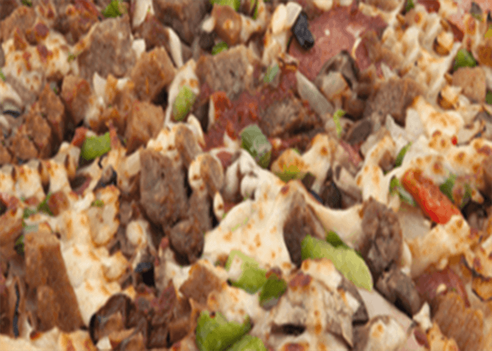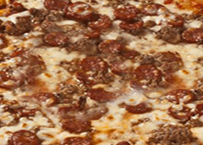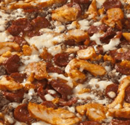 Tomate, double fromage, pepperoni, jambon, champignons, oignons, poivrons, boeuf épicé, olives.