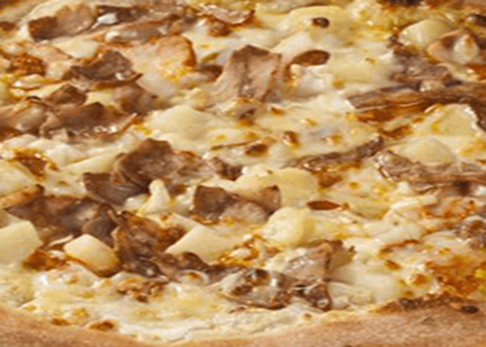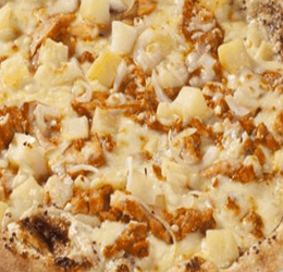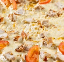 Tomate, fromage, champignons, poulet rôti, merguez, oignons, crème fraîche.