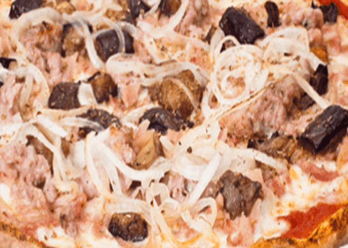 Tomate, fromage, boeuf haché, aubergines grillées, chèvre, oignons.
